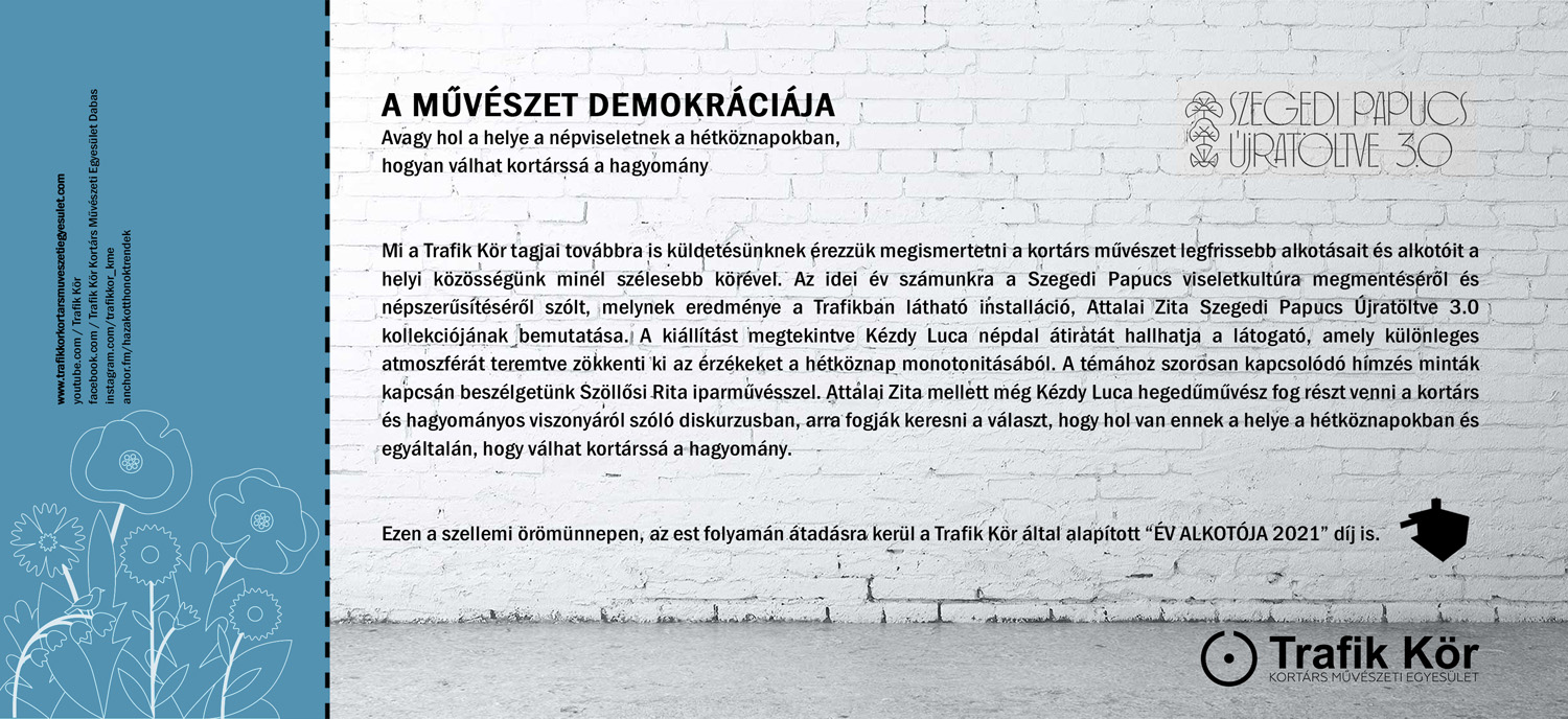 Az előadással egybekötött közösségi kerekasztal beszélgetés résztvevői ezt a jelenséget járják körül, bemutatják tevékenységüket a közönségnek, majd Kézdy Luca hegedűművész előadja a Hidegen fújnak a szelek című népdal hegedűre írt zenei átiratát, mely a Szegedi Papucs Újratöltve 3.0 kollekció inspirációja alapján a Trafik Kör Kortárs Művészeti Egyesület felkérésére készült el 2020-ban. Az esemény zárásaként átadásra kerül a 2021 évi – a Trafik Kör által alapított – ÉV ALKOTÓJA díj is.