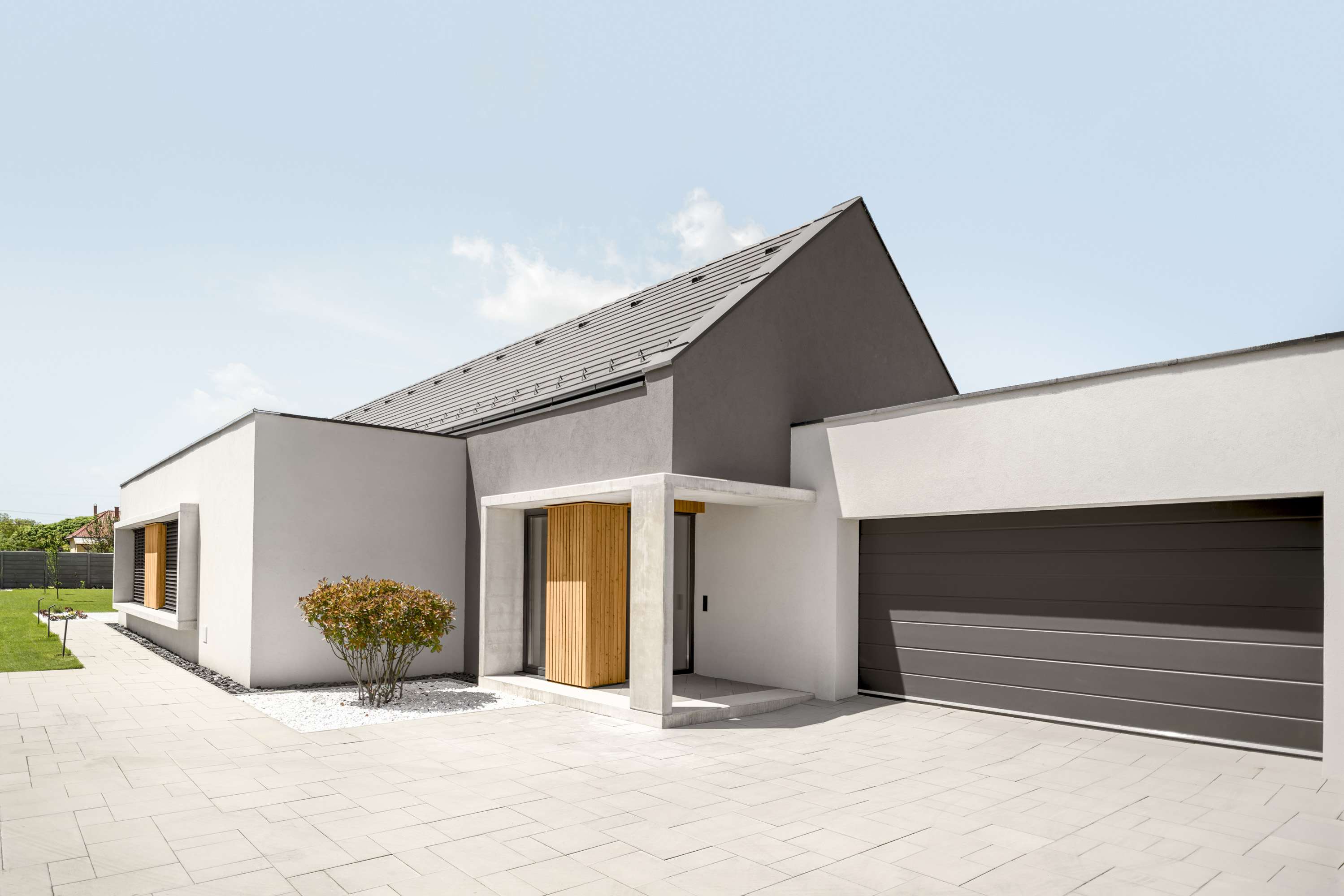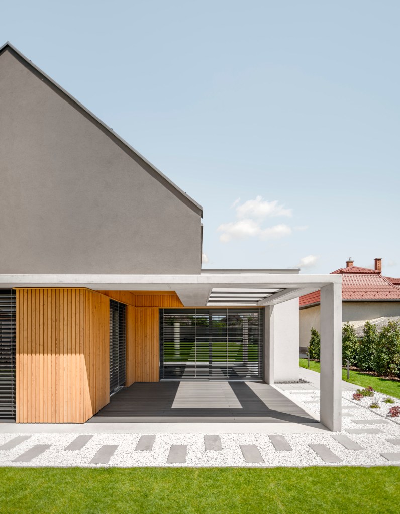 Az épület tömege és külső megjelenése azonnal közli, milyen vizuális világ áll közel a megbízók szívéhez: olyan minimál, ami egyszerűségében is otthonos. Összefogott formák, akromatikus színvilág, meleg, világos színű fa, és magas minőségű anyaghasználat, illetve részletképzés. A sötét színű magastetős tömeghez fehér lapostetős toldalékok kapcsolódnak – garázs, bejárati előtető, terasz, illetve a nappali terek sávja; a funkcionális elosztás már a tömegről jól leolvasható. A sötét színűre festett magastetős kubus aránya teljesíti az építési előírások által megkívánt feltételeket. A különböző magasságú, fehér lapostetős szárnyak közrefogják ezt a domináns, archetipikus házformát, aminek antracit színe, nyílások nélküli oromfala átértelmezi, modell értékűvé transzformálja a hagyományos típust.