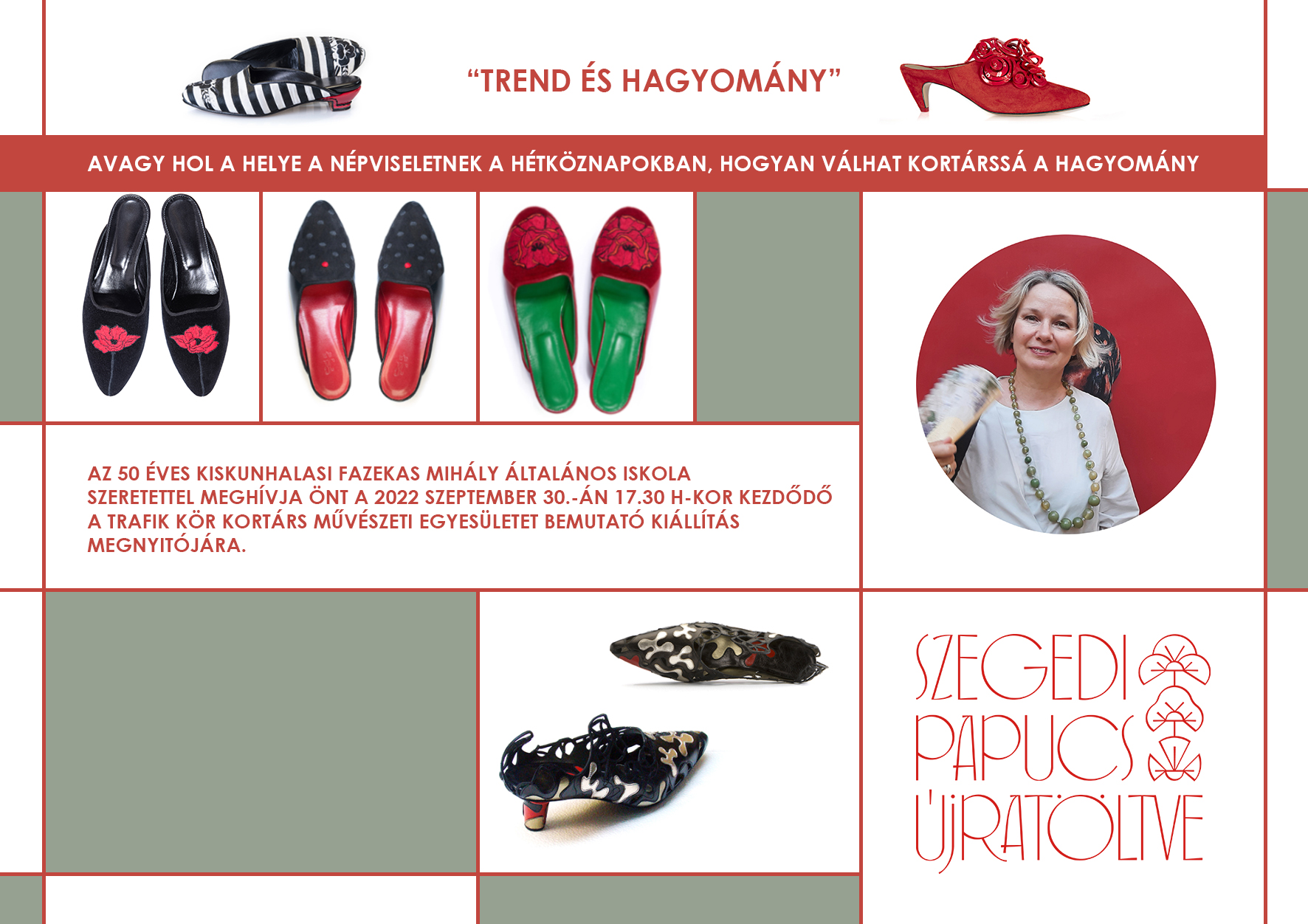 A születésnapi gála rendezvényén a “Trafik Mítosz” sokszínű kockái alkotta több dimenziós installációból kiemelkedő Attalai Zita – a Trafik Kör tagjának – cipőszobrai és az újragondolt szegedi papucsok egészen különleges hangulatot teremtettek az iskola aulájának. A szegedi papucs hagyománykincs értékmentéseként létrejött papucs formatervek és a világ design múzeumait bejáró egyedi cipő műalkotások november közepéig lesznek részei az ott tanulók mindennapjainak tökéletesen képviselve ezzel az egyesület törekvéseit, azaz a művészet legyen minél többször része a hétköznapoknak.