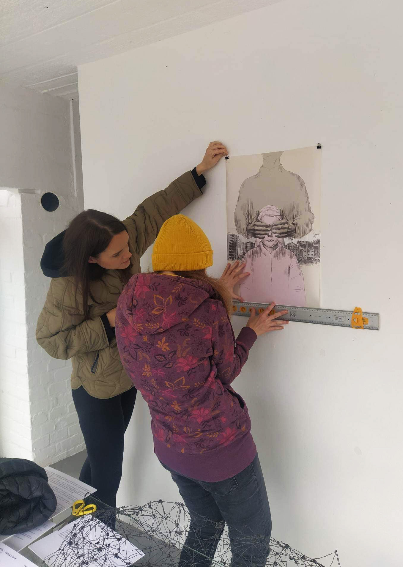 Графічне концентрування на руках це символ дії, ЩО ми можемо зробити за тяжких обставин, бо ми мусимо щось робити, а не піддаватися на апатію і шок. Або обійняти міцно того кого можемо втратити, або намагатися піклуванням уберегти своїх дітей, бо жодна дитина не заслуговує проживати війну. Або брати рюкзак і тікати від війни.