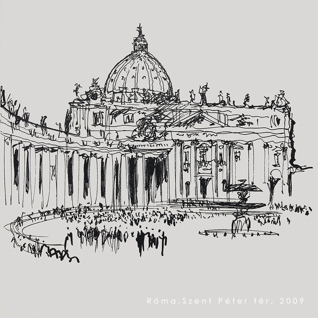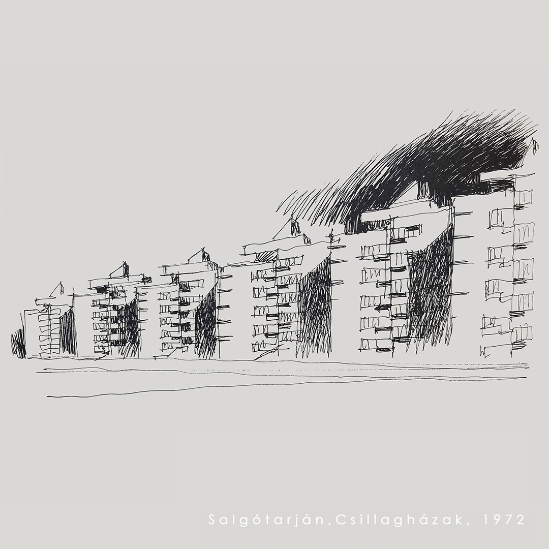 1958, azaz diplomázásom óta az ÉPÍTÉSZET teljesen magához béklyózott, életem meghatározó lényege lett, s bár építészként is a rajz, a rajz által vezetett, azzal párosult gondolkodás tervezési metódusom alapja, munkamódszerem (ha van ilyen) az örökös vázolás, s e vázolások által feltett kérdések – és persze a rájuk adottválaszok előre araszoló folyamata, amely elvezet tereim és formáim valóságáig.